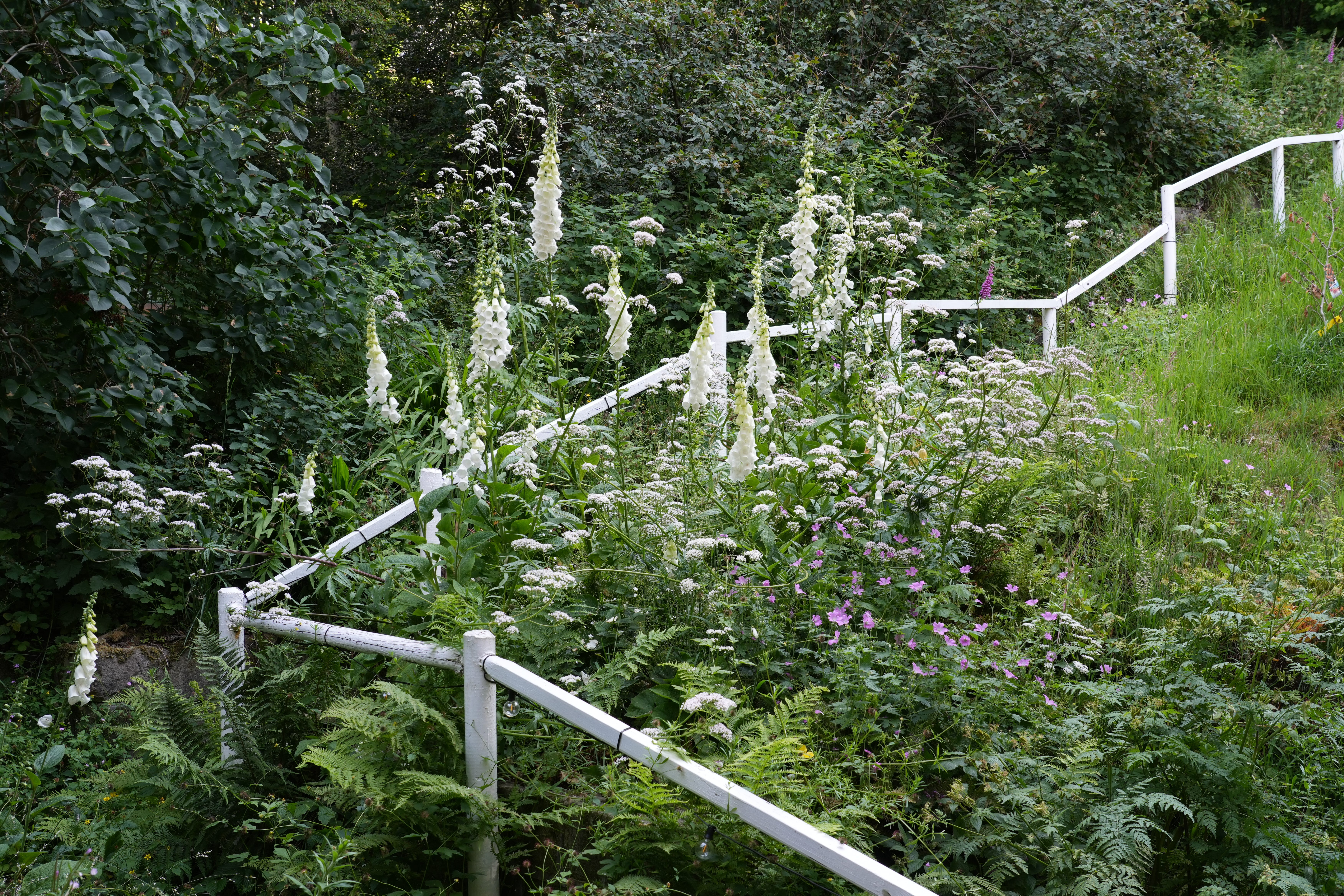 When you see an f. in the botanical name of a plant, it means ‘form’, which is a very subtle difference in form to the species, but is otherwise the same. In wild foxgloves’ case, the difference is the lack of pigment in the flower making it white. A common occurrence in most wildflowers around the world. In this shaded corner of a design at the IOU Hostel terrace garden, we planted lots of the white form of foxglove to help lift this duller area. I like how they work with the painted hand rail. I’m hoping these will self sow around to establish an ongoing plant community.