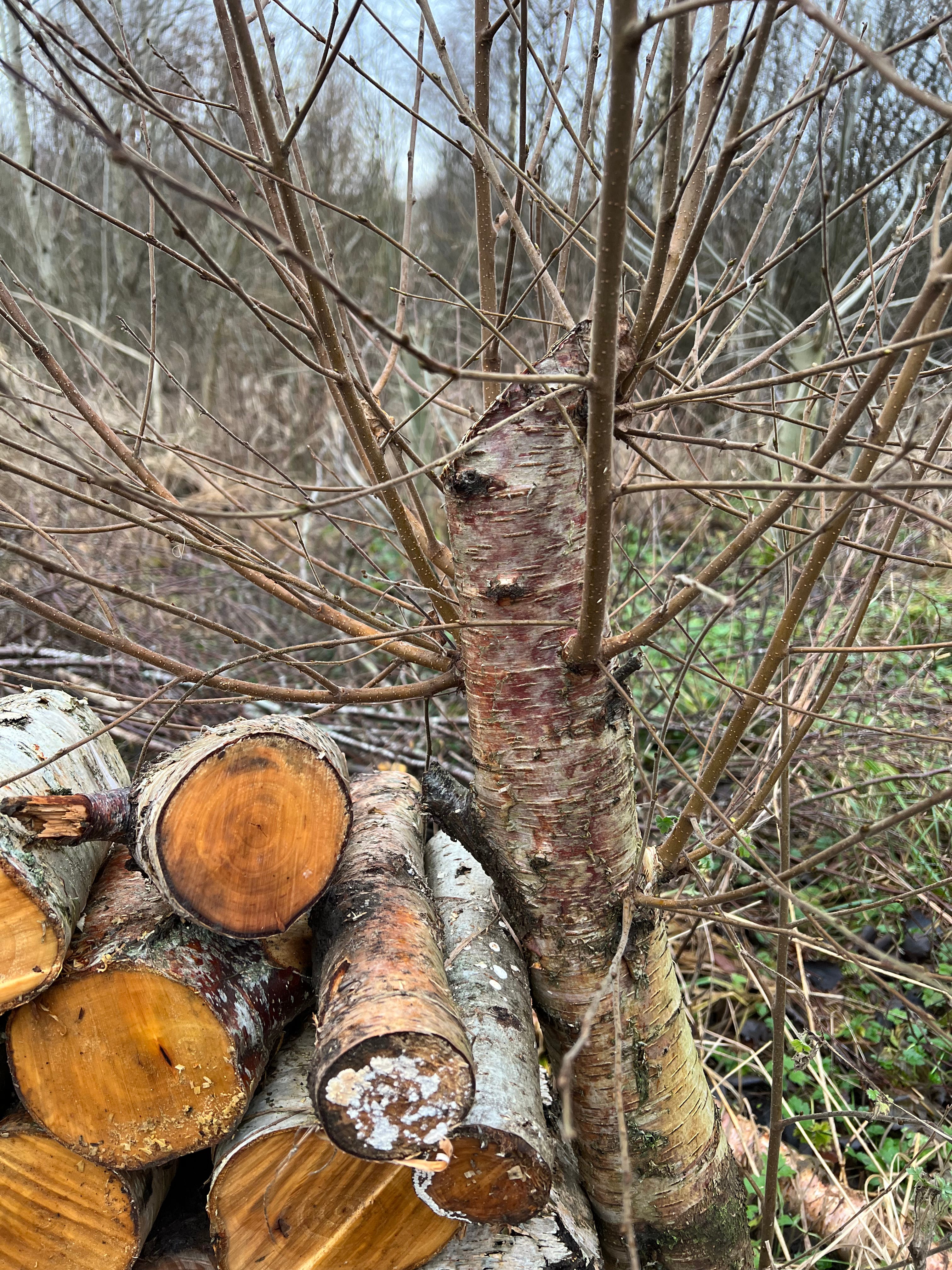 Coppicing is an ancient technique that involves cutting a tree to the ground that you know will reshoot. Most deciduous trees will do this if you cut when they are relatively young. It’s hard to judge when the age is right, you learn from experience, though you can research in books and online for tips. I’ve been pollarding some, which is the same thing but higher up. You can see the shoots on a birch I pollarded last year above, eventually forming many branches.