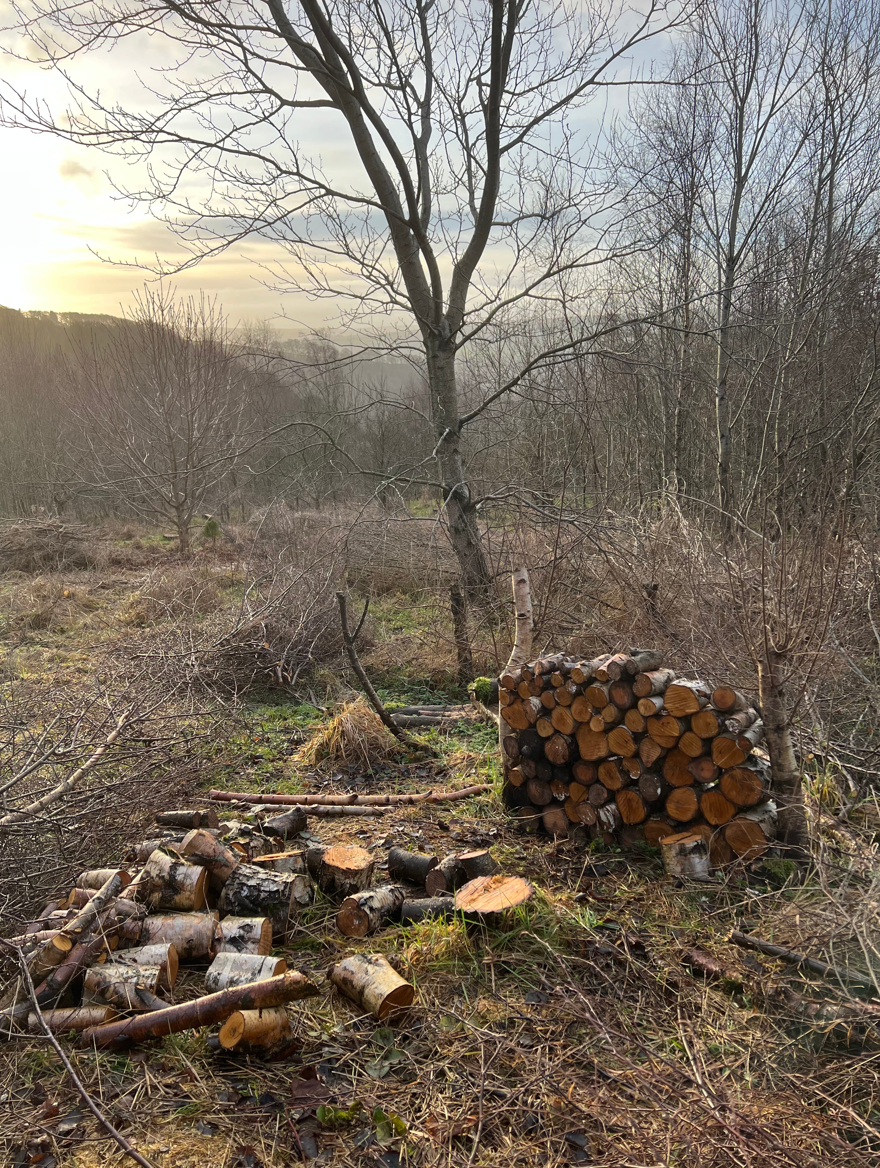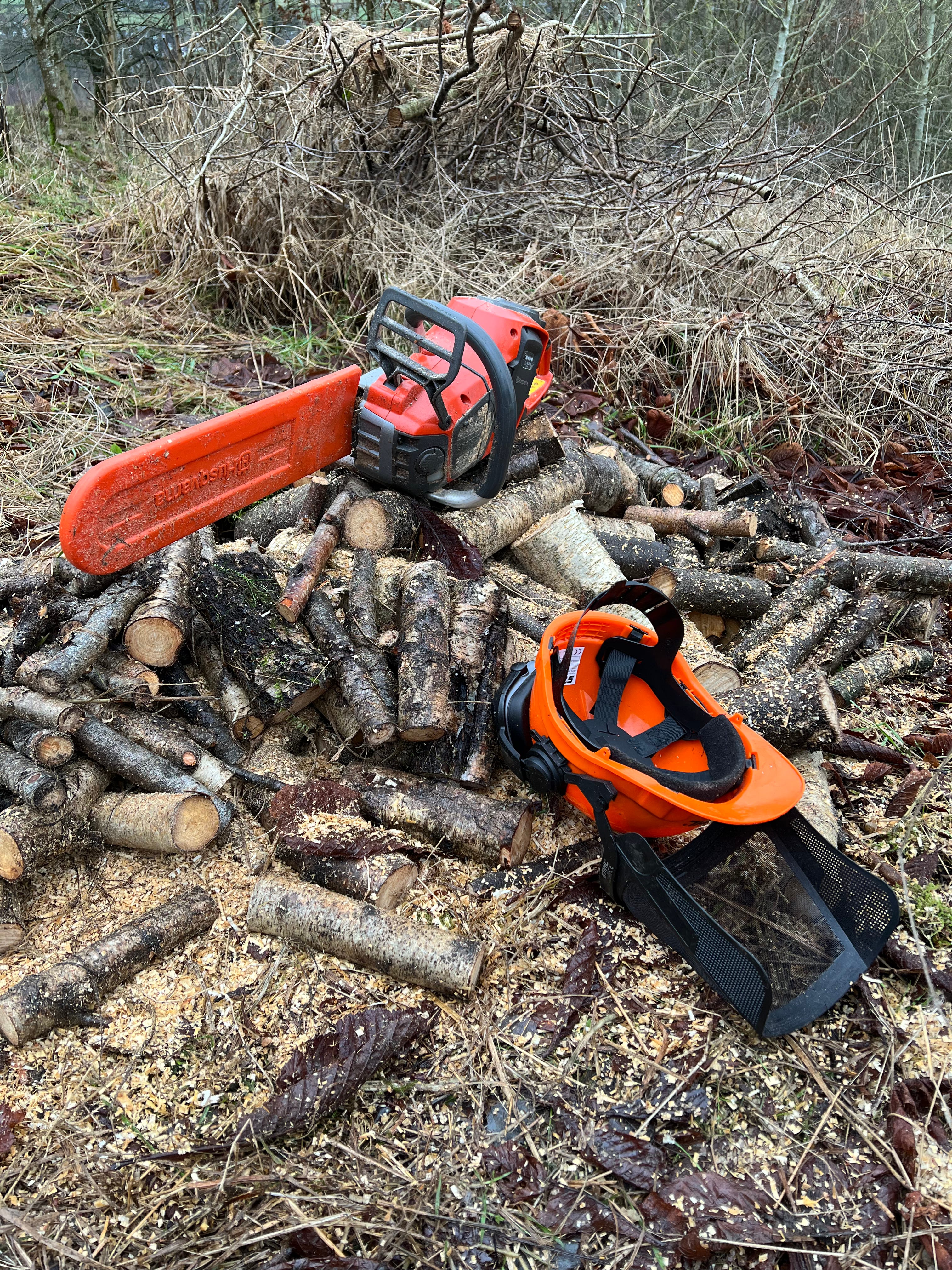 In the garden you can try this using a hand saw (as I do) but when managing a larger scale woodland a chainsaw becomes an essential tool. I use battery powered ones and have been on a week long course with certification, since gaining lots of experience. Chainsaws are dangerous tools and I only recommend people use them after having attended such a course where you learn about maintenance and PPE (personal protective equipment), of which you need lots.