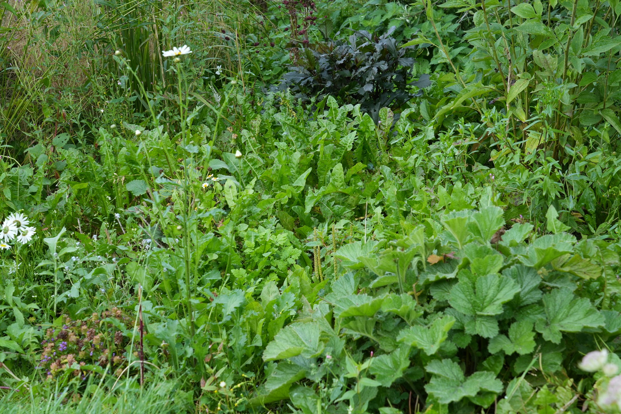 Dandelions have always loved our garden, whatever the weather. They’re enjoying the damp, but so are some of the suppressing plants I’ve added that are beginning to outcompete the dandelions. The geum in the bottom right corner of the above photo is doing a particularly stellar job of this. Like the nettles, we want dandelions but in balance with everything else. In the grass paths and meadows we encourage them, and we leave them in the planting areas these days rather than dig them out, unless they are swamping another young plant.