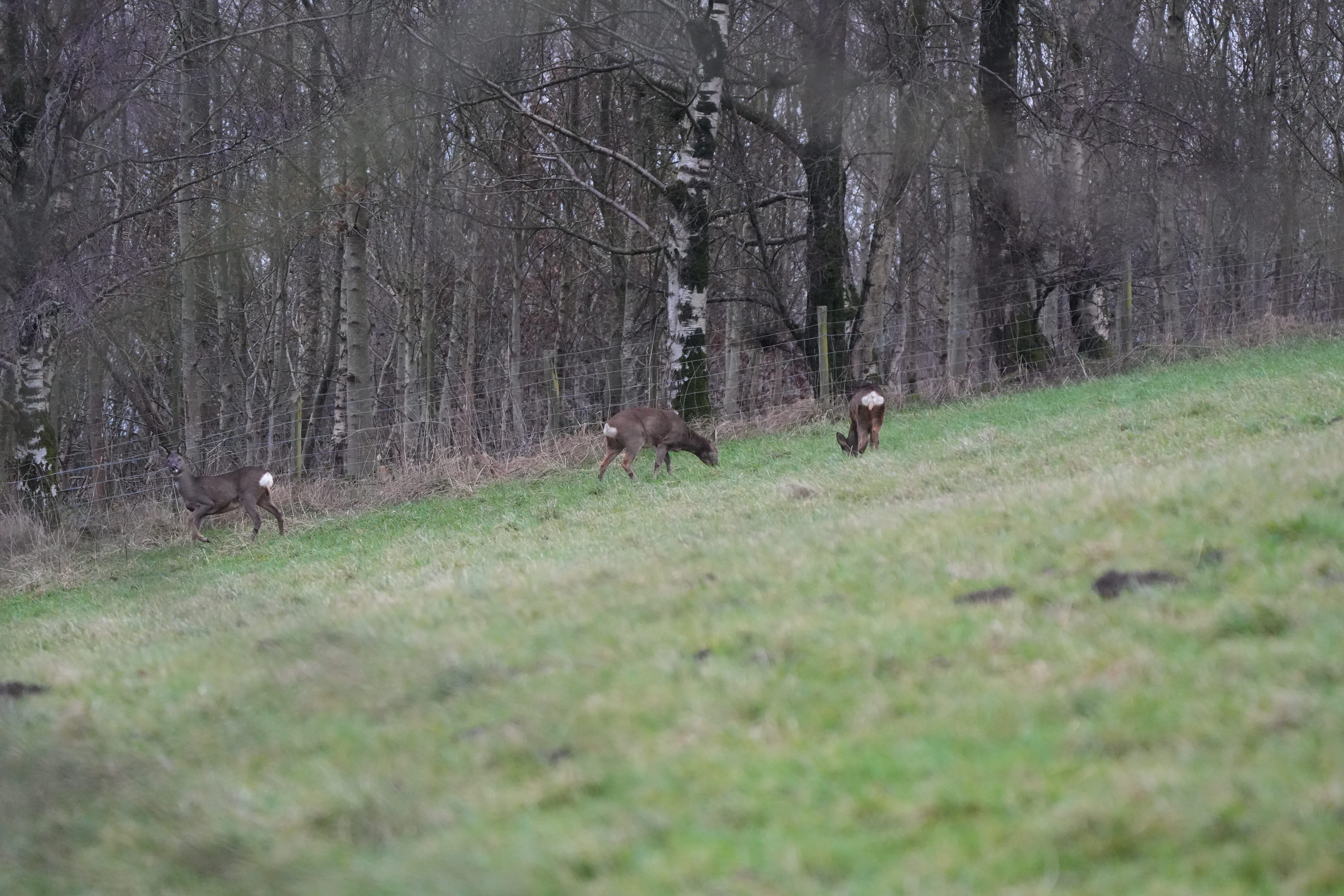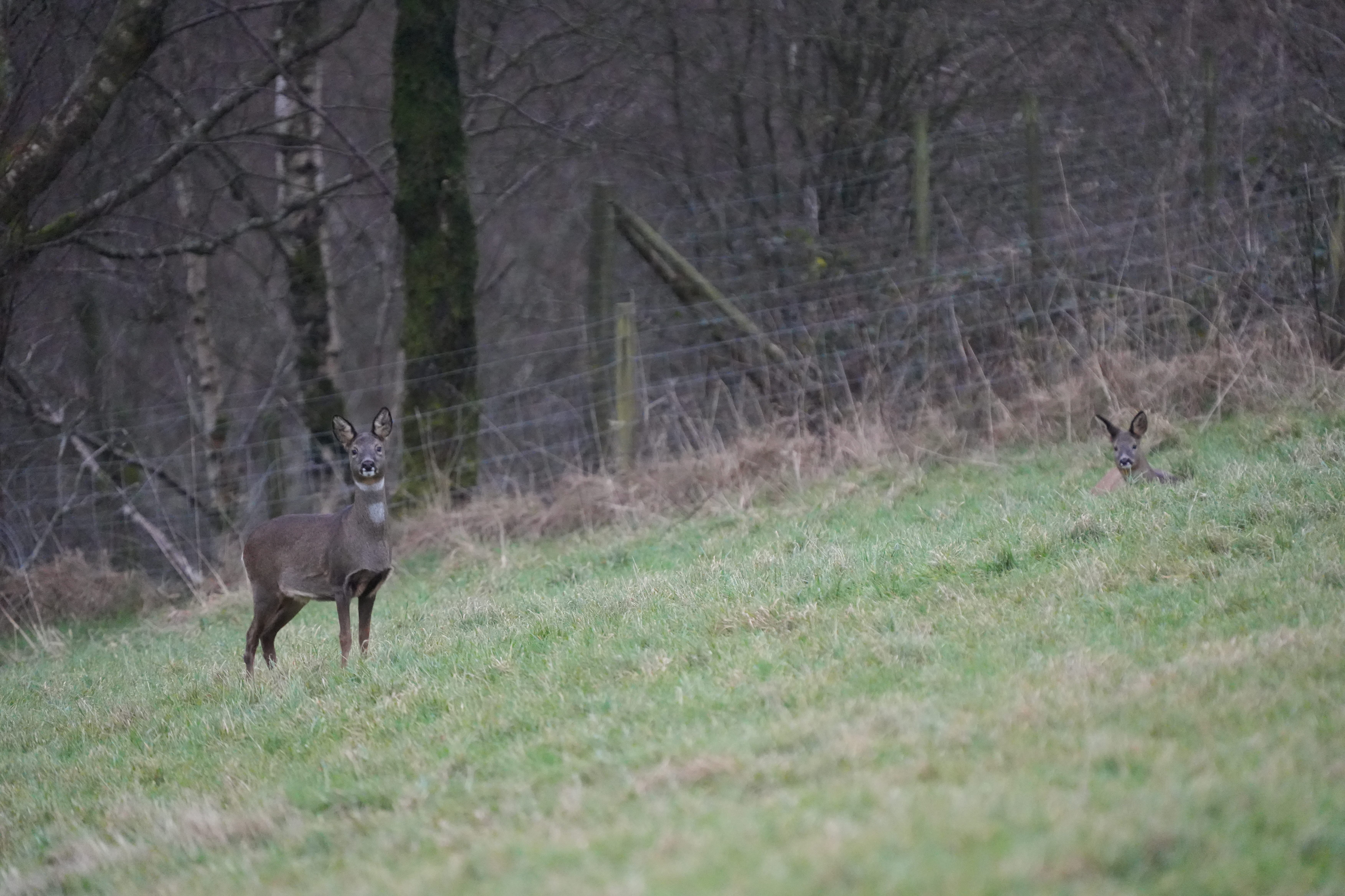 There are four ears directed at me in the grass, and the two European roe deer stand up alert, their distinctive white patch on the rears visible. One has a single antler, a male buck in the process of shedding them, as they do each winter. New antlers will already be growing beneath, downy like felt through winter, a layer rubbed off to reveal the wooden crown for rutting in spring. Roe deer antlers are quite small and vertical compared to other deer, though they do grow larger as the males age.