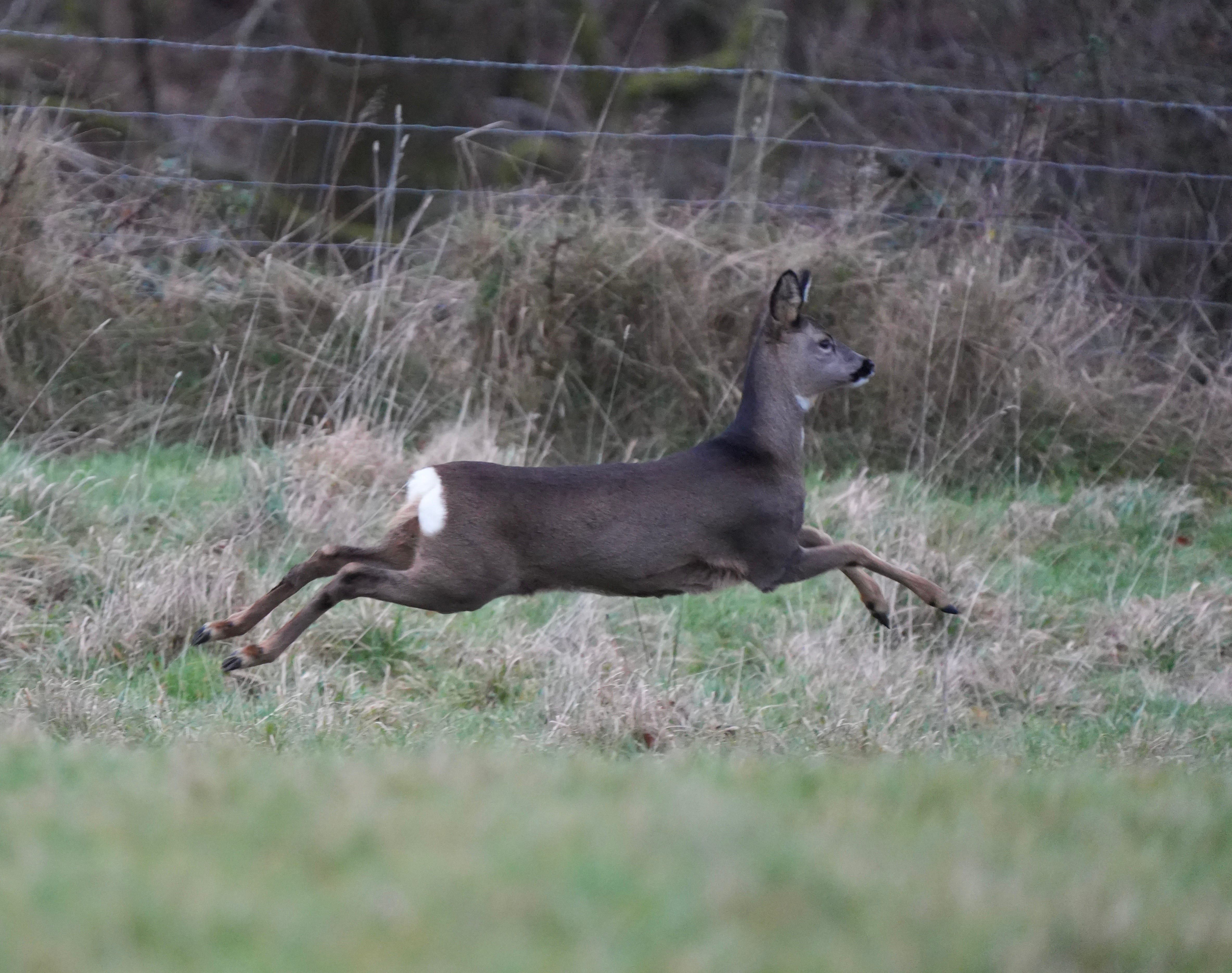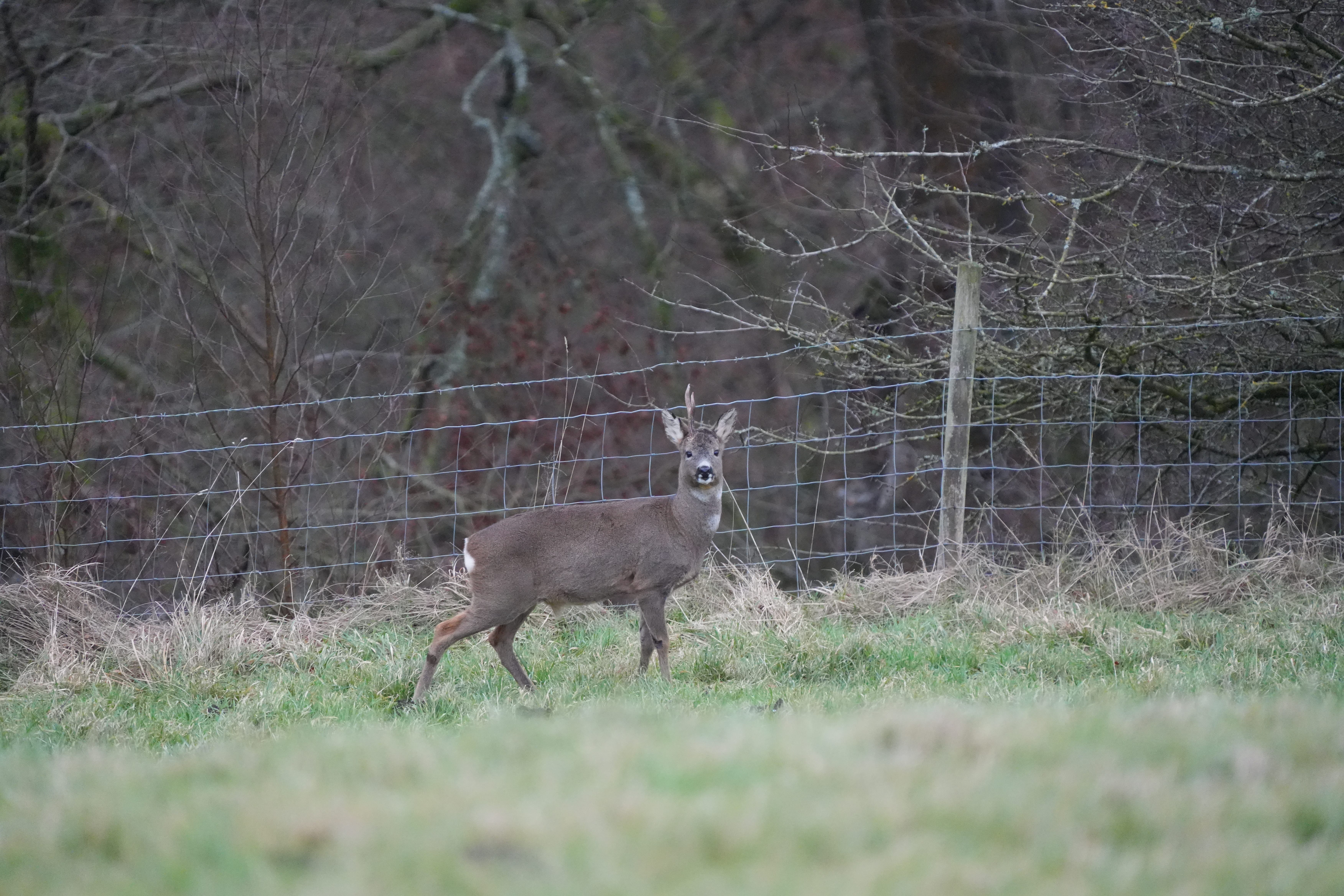 Walking down the slope of our farm carrying my heavy wildlife lens looking for birds and finding none, I chance my luck in the meadows. A robin sings somewhere close by, the distant call of a jackdaw in the light mist. Either will do, I love them all. A gull glides too far away in the sky. When ahead of me, in the grass at the far end of the field a movement and, after almost four years of sharing this place with them, I know who it is, the family of roe deer that call this hill home. Having a rest in the grass, which is dry for once.