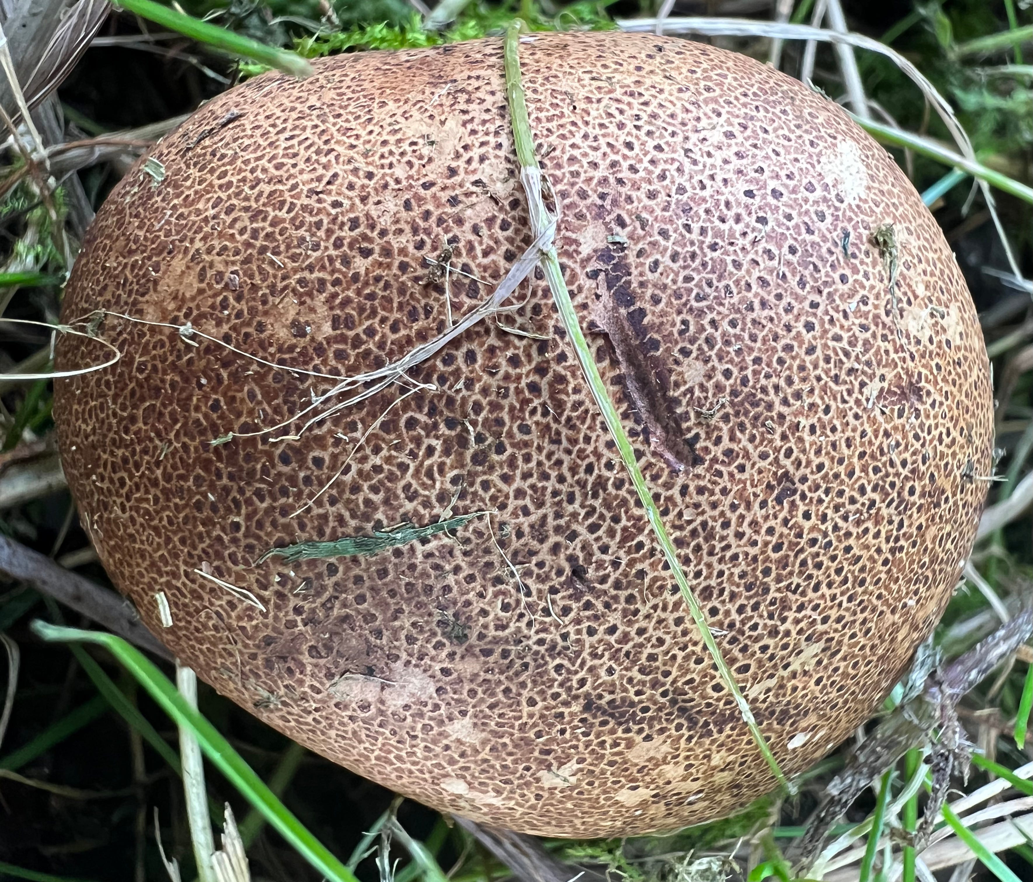 Much less edible is leopard earthball, Scleroderma areolatum, a fungus we have growing around our farm under oak trees. Poisonous but fun to spot emerging as this patterned blob, before it bursts open to puff spores into the air when it rains.