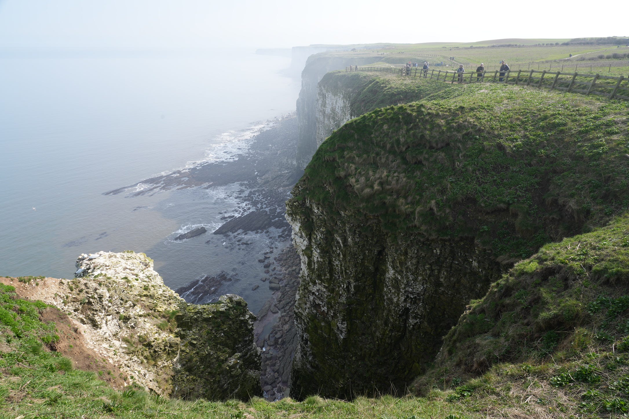 Strolling toward the main event, the sea finally comes into view and I breathe out deeply. The top of the cliffs are lined with day tripping wildlife lovers walking along the miles of reserve. When I finally reach the edge I meet a breathtaking scene. A 100m drop straight down with birds soaring or resting with occasional echoing calls.