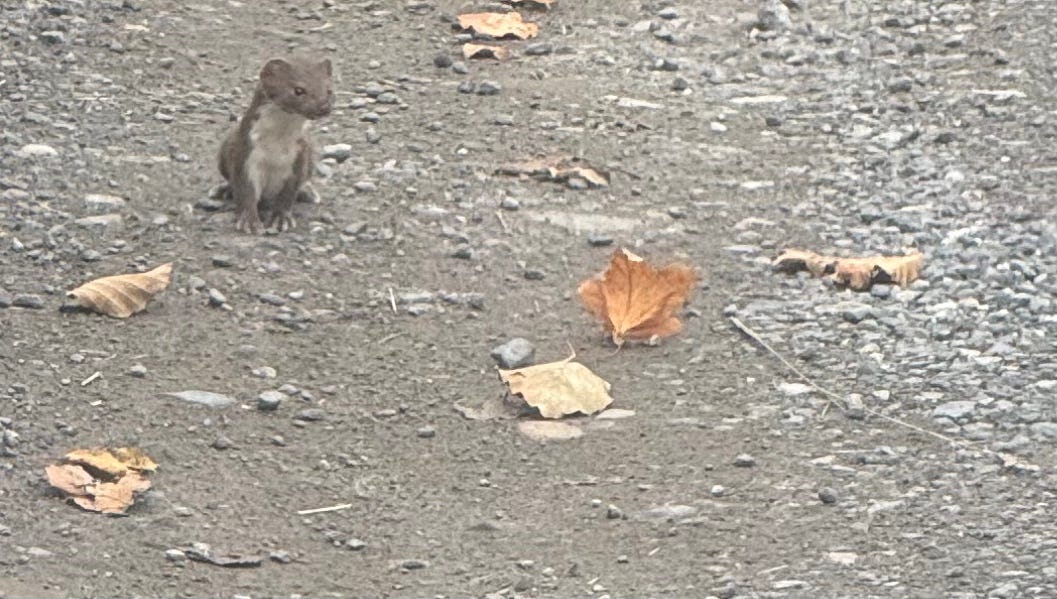 I managed to capture a few close ups of the weasel and the dead rat with my zoom lens but, while it’s not at all gory, I decided to spare you in this newsletter.